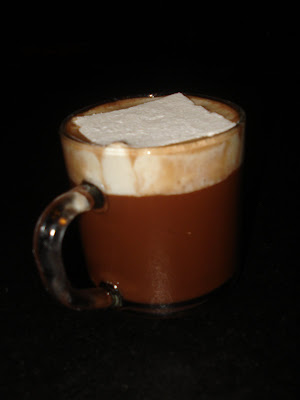 So that’s what we did: up the proportion of chocolate, use water, and put it all in a smaller mug. It’s perfect: flavorful tequila wrapped in an intense hit of chocolate, with an adult marshmallow on top.